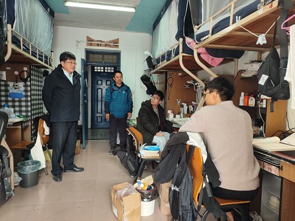 党委书记陆坤带领辅导员一起走进学生宿舍,了解关心学生学期末思想动态、复习备考和检查宿舍安全等情况。