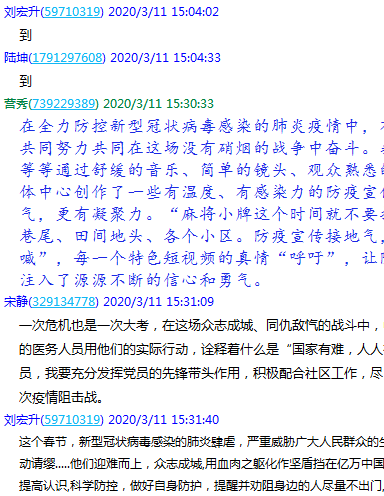 本次学习的主要内容包括:在中央政治局常委会会议研究应对新型冠状病毒肺炎疫情工作时的讲话;学习《中共安徽省委统战线工作部关于开展向施咏康同志学习的通知》;学校宣传部《关于做好疫情防控期间政治理论学习的通知》以及《近期政治理论重点学习内容》;我校《关于疫情防控期间加强师生医护员工思想政治教育的通知》等。学习形式为群内签到、群内讨论交流的形式。各位党员同志就学习内容以及疫情期间的教学、所见、所思、所感等积极交流讨论。