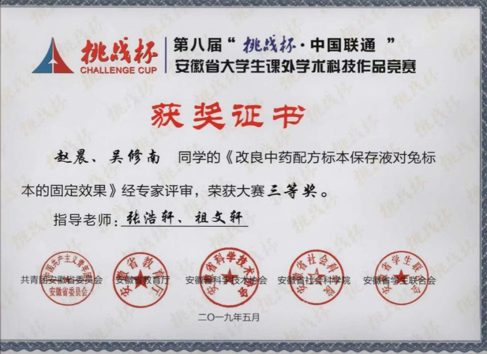 2015级学生赵晨在第八届“挑战杯”安徽省大学生课外学术科技作品竞赛中荣获三等奖,展现了51风流