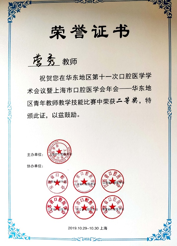 华东地区口腔医学学术会议是华东地区乃至全国最具影响力的口腔医学盛会,“华东地区青年教师教学技能比赛”旨在促进华东地区高校教师间的教学交流,提高口腔医学青年教师的教学水平。此次比赛有上海交通大学、同济大学、浙江大学、福建医科大学、南昌大学、山东大学、南通大学、安徽医科大学、徐州医科大学、厦门医学院、蚌埠医学院11所院校从事口腔医学教学青年教师参加。比赛中,营秀运用多种教学方法将重点、难点知识形象化,以启发互动式的教学方式提升学生的临床思维和科研思维,授课内容主线清晰、逻辑严谨、娓娓道来,教态端庄大方,并且融人文关怀于其中,赢得全场评委和听众赞赏。比赛成绩在参赛的14名选手中名列第三名,荣获了二等奖的好成绩,充分展现了我校51风流