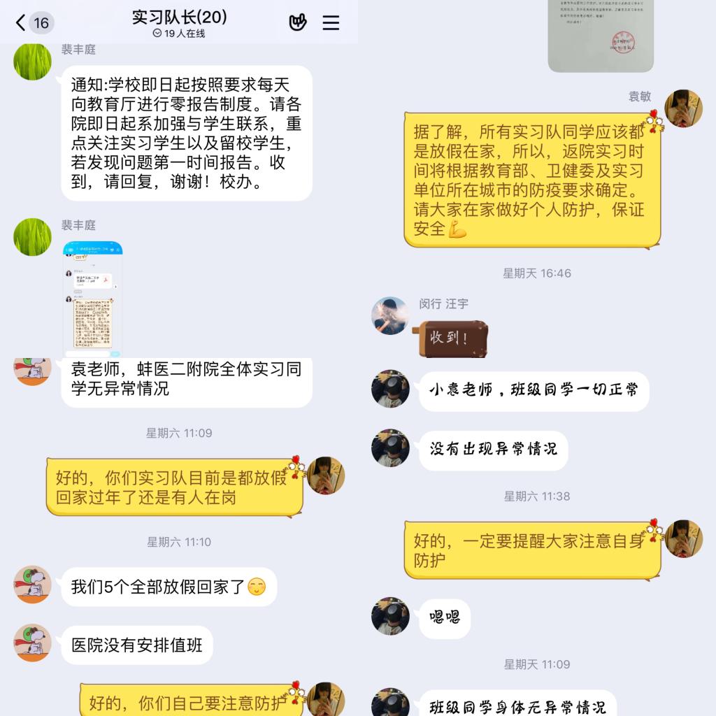 学生年级立即通过电话和QQ将文件精神进行传达并布署,了解所有实习同学的在岗情况,在稳定思想的同时叮嘱全体同学要提高防范意识,做好科学防护,保证充足睡眠。春节期间做到不聚餐、不串门、出行戴口罩。
