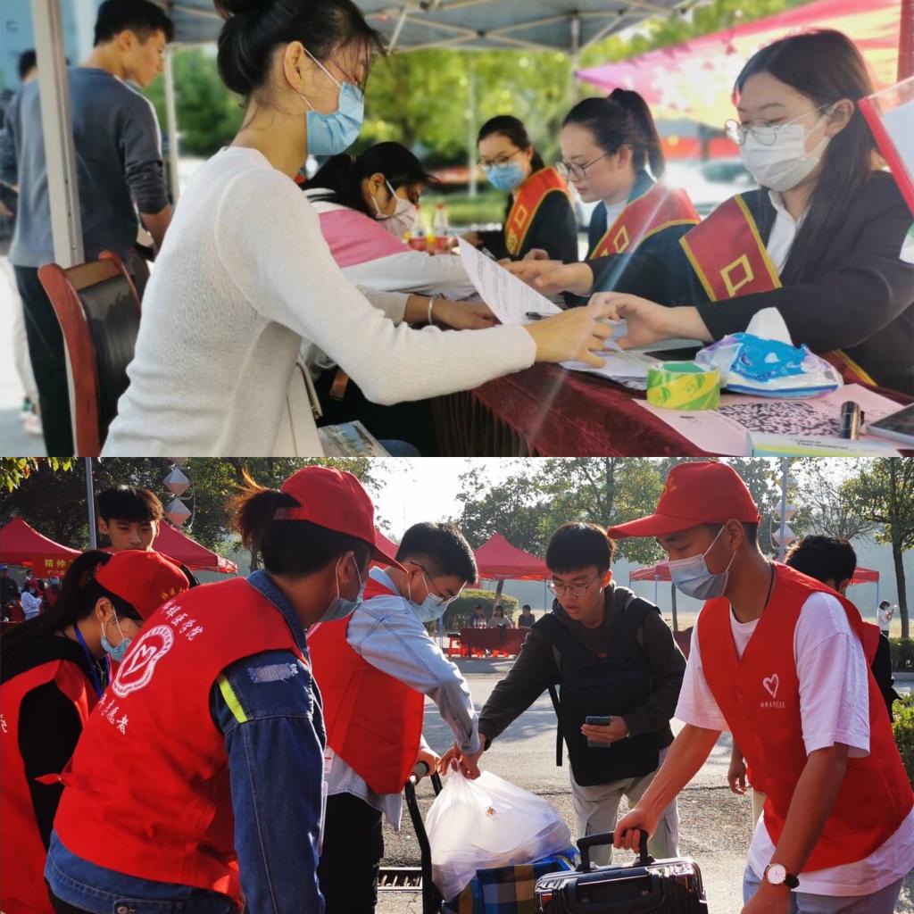 全体志愿者身着统一服装,在学校东门、南门均设有服务台,新生进校时,志愿者们热情接过行囊,陪同他们熟悉校园环境、办理入学手续、发放防疫装备、于签名墙前签名留影。看着新生们带着对校园以及未来的憧憬,满怀期待地加入这个幸福而又温暖的大家庭,每一位志愿者都感到欣慰与满足。