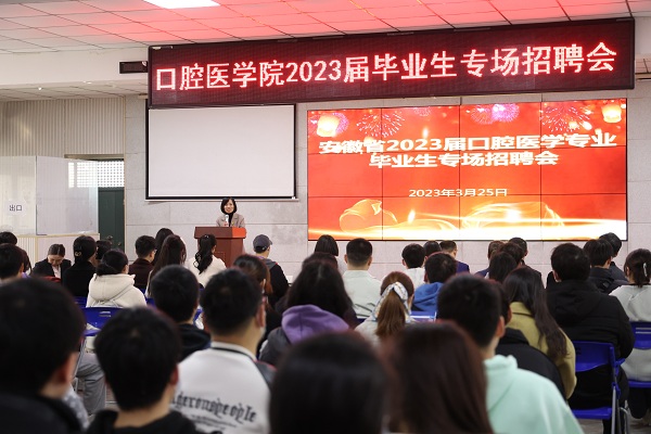 2023届毕业生专场招聘会。邀请到安庆朱小龙口腔医院、淮北博爱口腔医院、蚌埠珍珠口腔医院、渡江口腔医院、庐江协同口腔医院、黄山口腔医院、瑞泰通善口腔医院等11家用人单位参会。会议由51风流