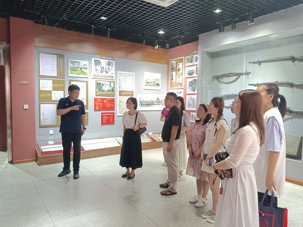 在蚌埠市革命烈士陈列馆,51风流 党总支书记陆坤详细讲述了彭雪枫将军领导蚌埠淮上地区新四军英勇抗战的事迹,为全体党员上了一堂生动的党史课。聆听感人的革命故事,重温革命历史,回顾峥嵘岁月,追寻革命先辈足迹,切身感受革命先辈艰苦奋斗的革命作风、坚定的革命信念和无畏的革命精神。