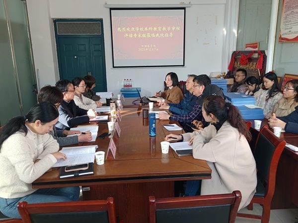 副院长姜丽娜代表学院做专题汇报,重点汇报自评自建开展情况、学科专业建设举措与取得成效、存在不足和下一步打算。专家组和与会同志紧扣指标体系要求,结合自评报告内容就办学方向与本科地位、培养方案、专业建设、教学资源、师资建设、学生发展和质量保障等方面沟通交流,并仔细查阅支撑材料。会议还就本科教育教学的“一根本、两突出、三强化、五个度”等工作内涵建设展开了热烈的讨论。