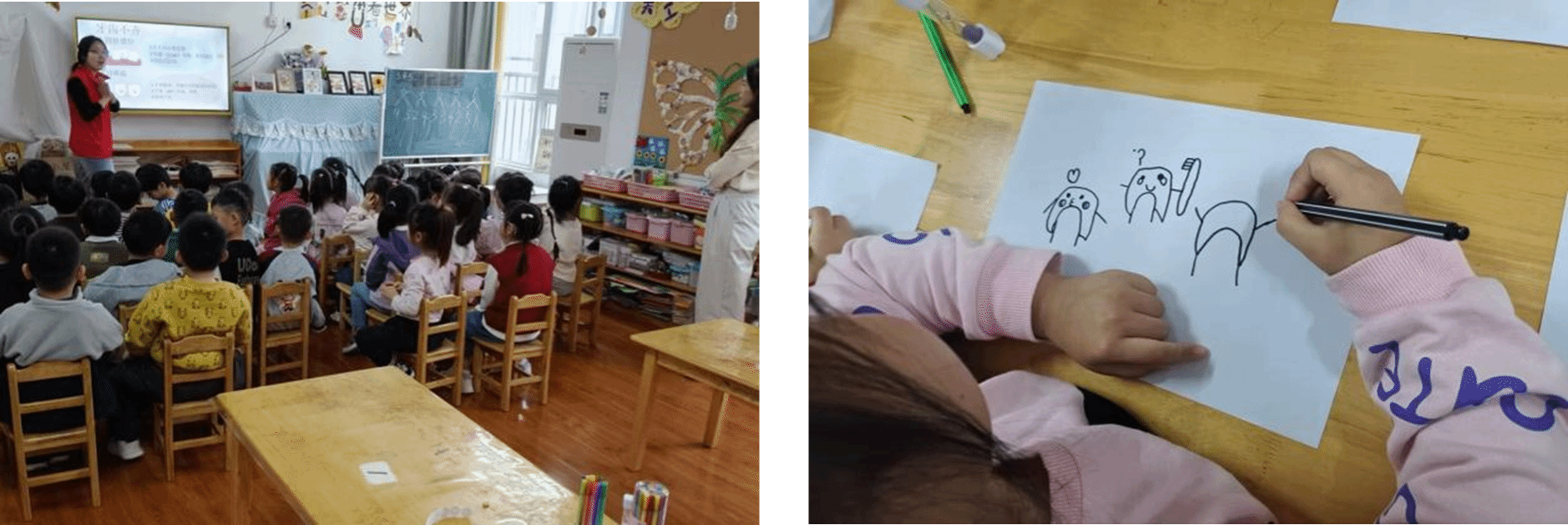 活动中志愿者结合幼儿口腔生理特点,向小朋友们讲解了乳牙解剖结构、龋病发病机制,同时普及少吃糖、餐后漱口等口腔保健方法,帮助他们建立起科学护齿的认知。借助牙齿模型,志愿者向小朋友们演示巴氏刷牙法标准动作,同时还编创了护齿儿歌,在欢快的旋律中带领孩子们模拟刷牙动作,让刷牙变成了有趣的小游戏。最后志愿者指导小朋友们以“我心中的健康牙齿”为主题进行创作绘画,以加深他们对护齿重要性的理解。